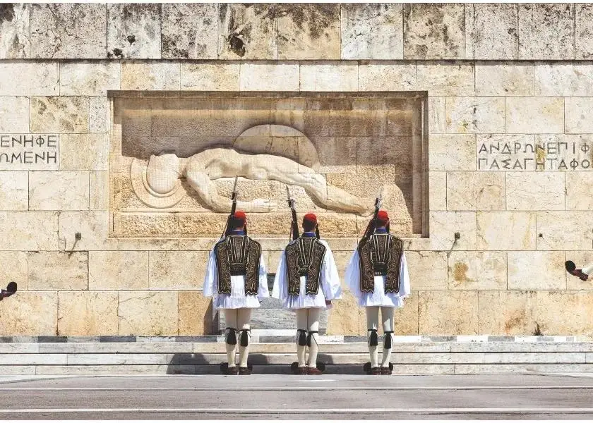 Vào mỗi giờ đúng, Quảng trường Hiến pháp ở Athens sẽ diễn ra một buổi lễ đổi gác đầy màu sắc. Những người lính mặc quân phục truyền thống, diễu hành theo nhịp bước độc đáo để hoàn thành lễ đổi gác. Sau buổi lễ, một số du khách sẽ tiến lên chụp ảnh cùng các binh sĩ. Nhưng nếu bạn đến quá gần, những người lính sẽ dùng cán súng đập xuống đất để cảnh cáo, âm thanh đột ngột này khá đáng sợ.