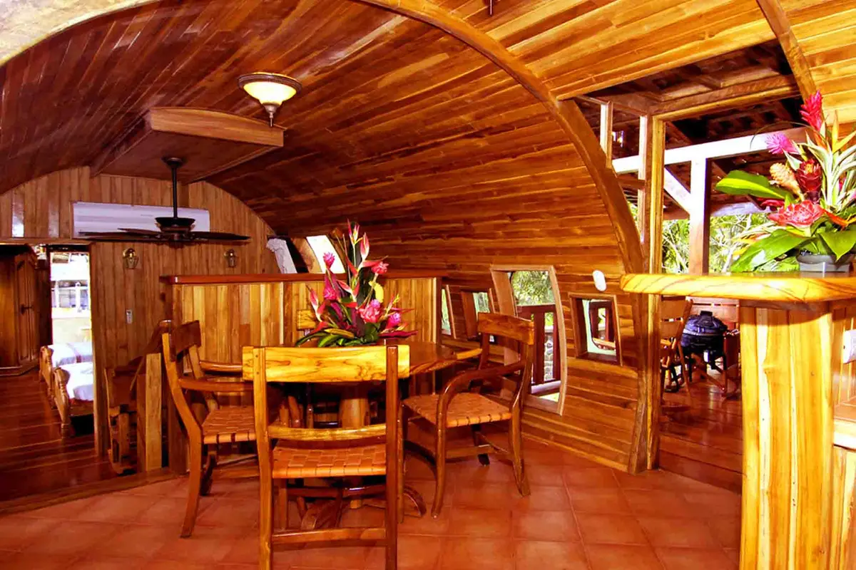 Khoảng 200 bậc thang ngoằn ngoèo lên, leo lên một sân gỗ tếch ấm áp và phong phú nơi có thể có đôi cánh. Một mái nhà dốc thoải rộng rãi mang lại nhiều bóng râm. Khu rừng sống động với tiếng gọi, tiếng sủa, tiếng kêu và tiếng khỉ. Rất nhiều con khỉ.