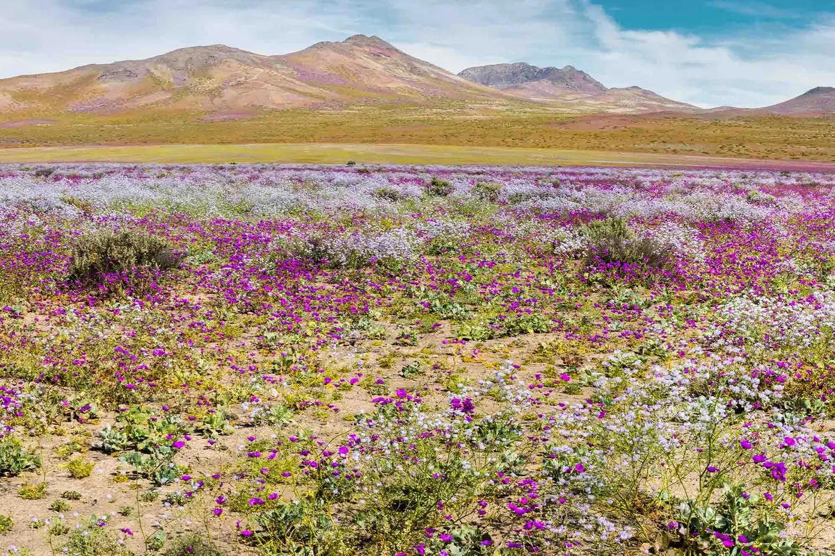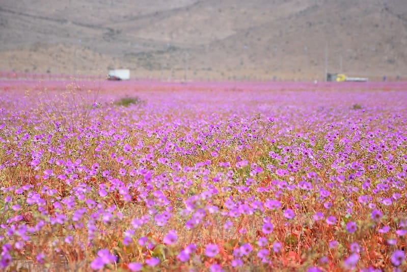 Một biển tím pastel đôi khi xuất hiện ở sa mạc Atacama thường bao gồm loài hoa pata de guanaco, mặc dù có khoảng 200 loài khác nở rộ bên cạnh nó, như garra de león đỏ tươi và schizopetalon trắng. Nhưng chúng không nở vào mùa xuân của Bắc Mỹ như người ta mong đợi khi sống ở Hoa Kỳ, mà là vào mùa xuân ở Nam Mỹ như một người Chile mong đợi; những bông hoa này thường xuất hiện từ giữa tháng 9 đến giữa tháng 11. Hiện tại là mùa đông ở Chile.