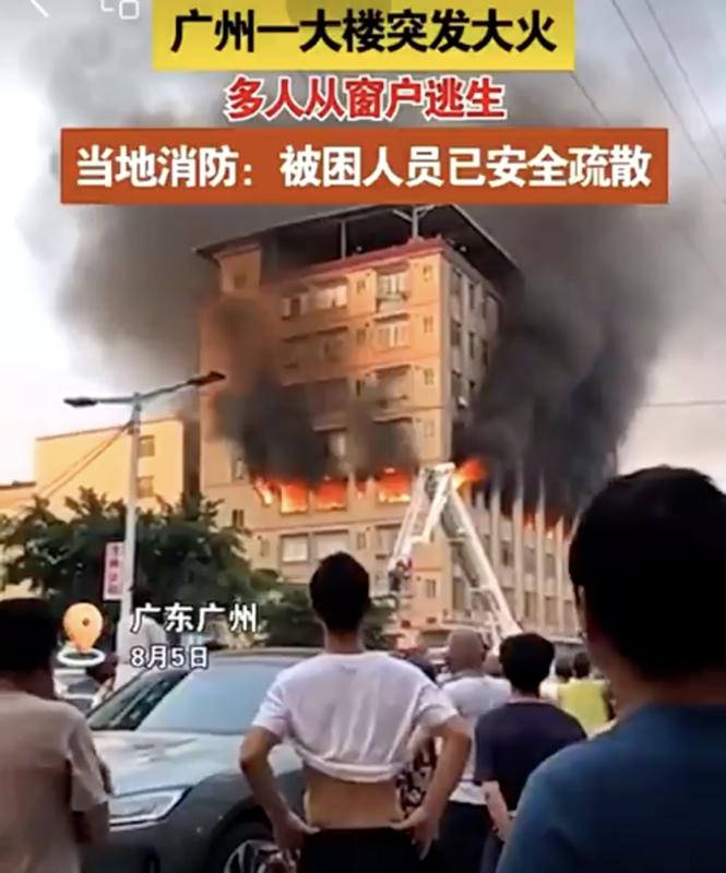 "Ngày 5 tháng 8, một tòa nhà cao tầng ở Quảng Châu, Quảng Đông bất ngờ bốc cháy, nhiều người đã leo thang từ cửa sổ để thoát ra ngoài. Sở cứu hỏa địa phương đã đưa ra thông báo cảnh báo: Những người bị mắc kẹt trong tòa nhà đã được sơ tán an toàn, đám cháy đang được xử lý theo thứ tự."